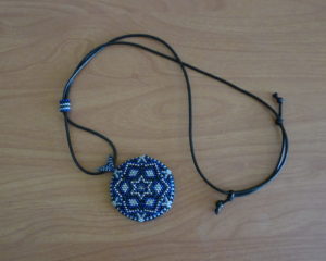 Wracając do koralików postanowiłam zrobić mandalę w odcieniu niebieskim. Jest ona dość spora, bowiem ma być ozdobą do swetrów z grubej włóczki. Zdjęcia robiłam wykorzystując tło z t-shirt -u.