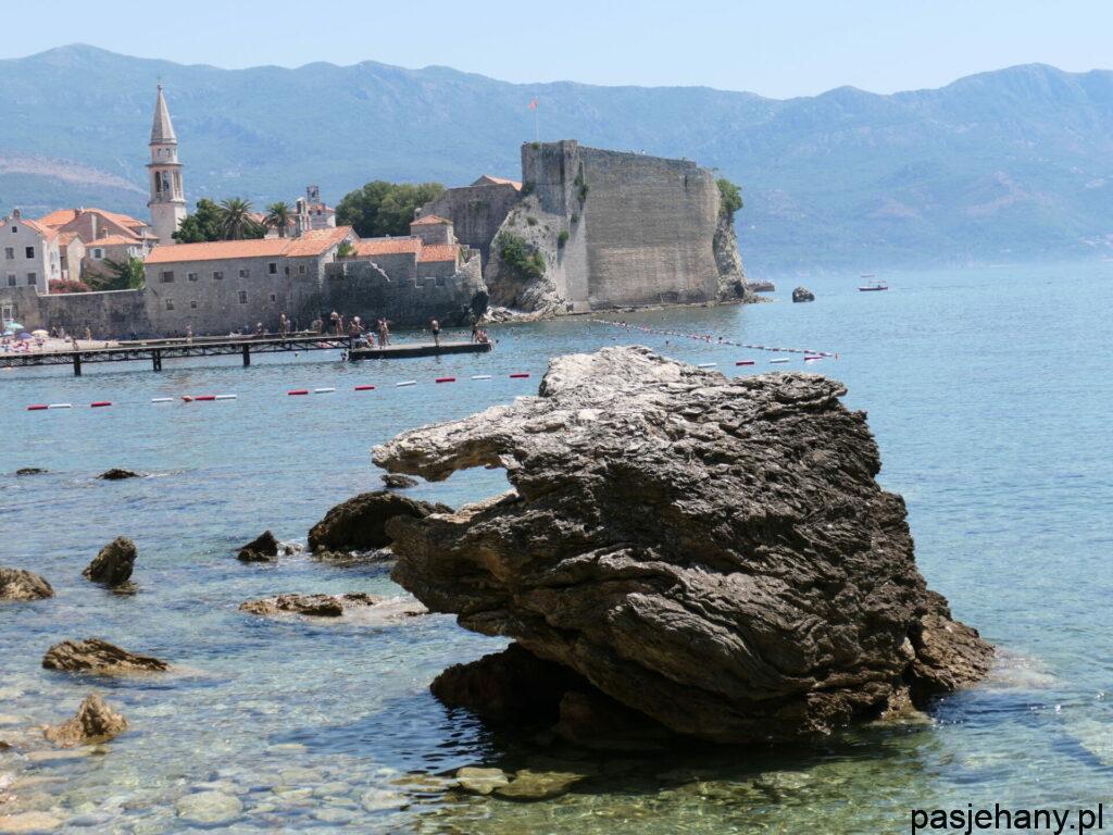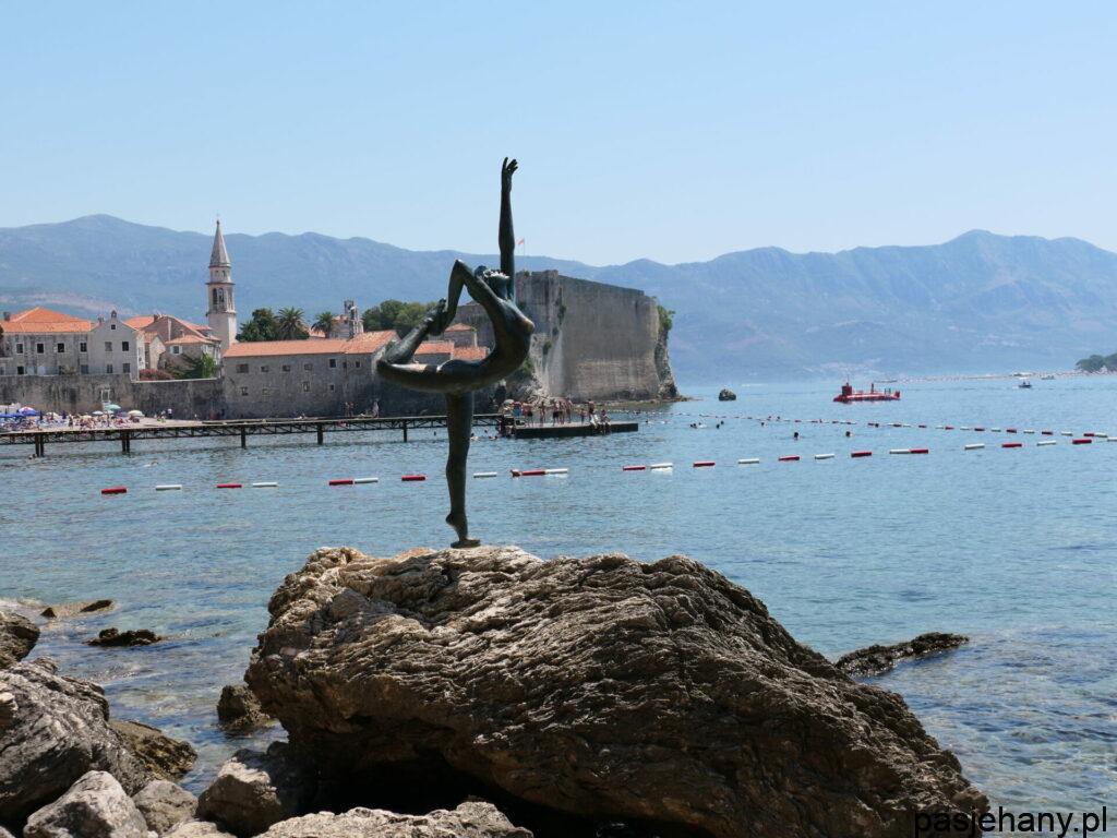 Potem jeszcze zatrzymujemy się w Budvie. Oczywiście bezpłatne parkingi są przepełnione. Ale znajdujemy parking płatny (5€) gdzie zostawiamy samochód i udajemy się starówkę. Ponoć większość została odbudowana po trzęsieniu ziemi. Niespiesznie spacerujemy uroczymi uliczkami a następnie wzdłuż murów obronnych opasających stare miasto. Z dziedzińca cytadeli rozciąga się widok na pobliską wyspę. Dalej kierujemy się na okoliczną plażę mijając charakterystyczną rzeźbę „Baletnicy” na tle murów obronnych.