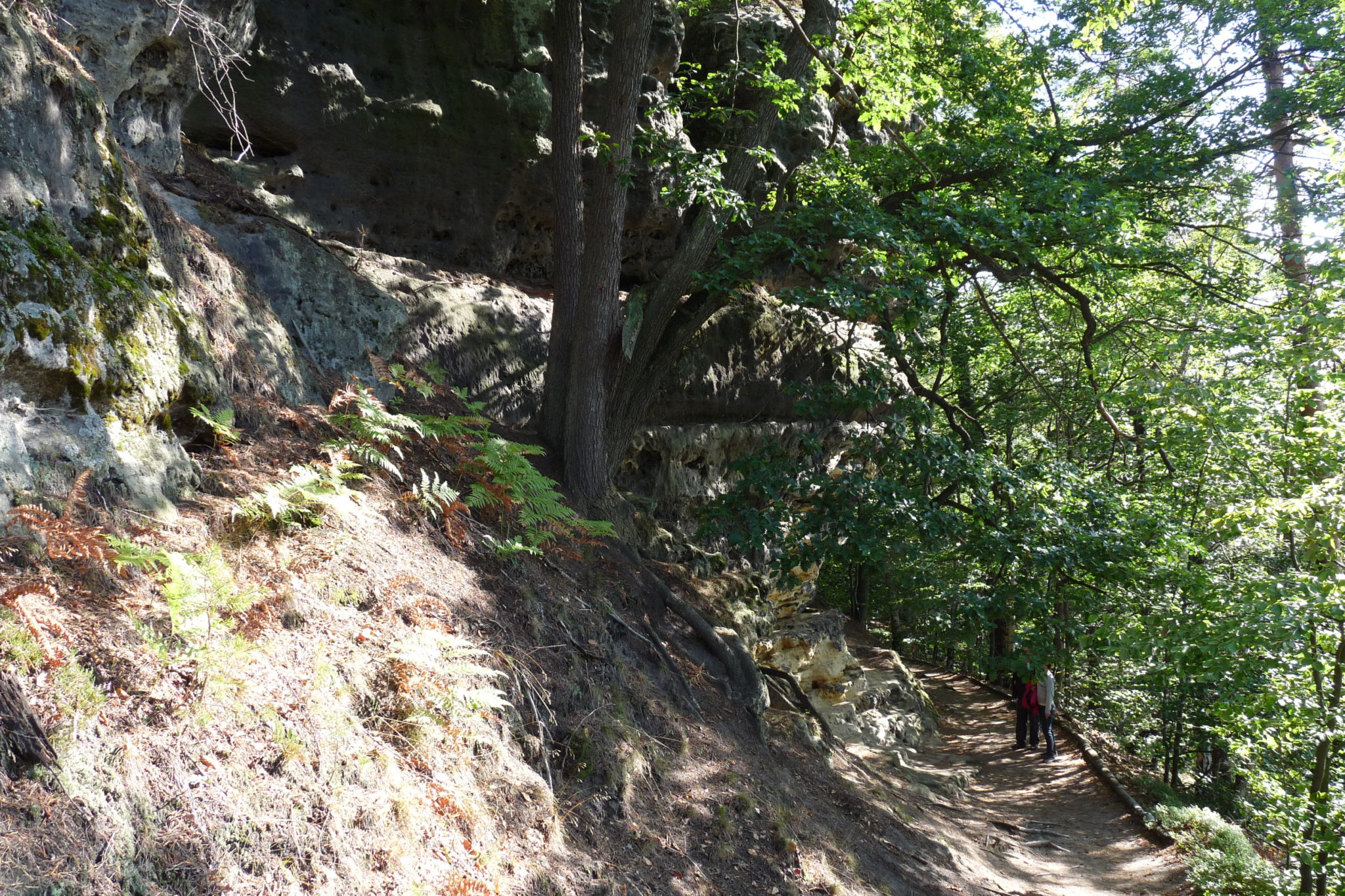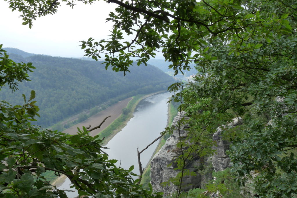 Ale nadal nie wiemy jak tam dotrzeć. Ostatecznie docieramy do Rathen skąd odchodzi prom przez Łabę. A stamtąd w górę dociera się do mostu w górach (czyli Bastei). Jest duży parking. Rezygnujemy i jeszcze raz jedziemy do Porschdorf. Tam znajdujemy parking w polu z postawionym parkomatem. Rezygnujemy i jedziemy dalej do parkingu w lesie. Bez parkomatu. Stąd ruszamy do Bastei. Bardzo ładną trasą (mniej niż 1h) docieramy do Rathen. Drogowskazy prowadzą nas do słynnego mostu. Ale ta trasa wcale nie jest taka łatwa jak opisuje to przewodnik. Podejście jest dość męczące. Ale widoki są tego warte.