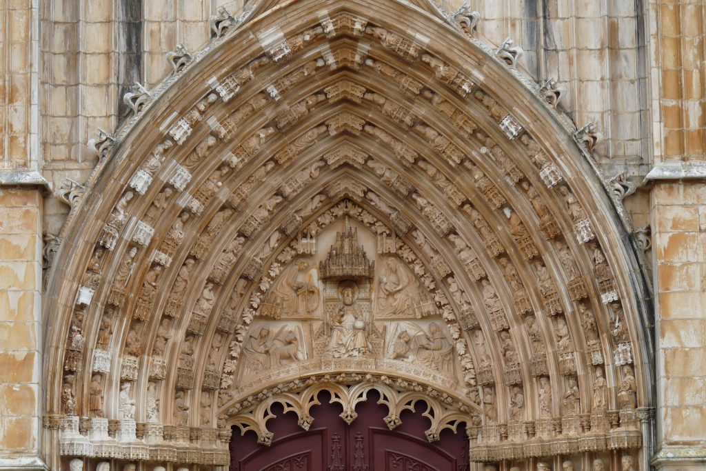 Batalha. Kolejny piękny klasztor założony w 1434 r. . Ozdobą klasztoru są Królewskie Krużganki – liczne kamienne zdobienia, płaskorzeźby robią na nas niesamowite wrażenie. wychodzimy z kościoła, a tu zaskoczenie – wychodzi Pani i kieruje nas do jeszcze jednej kaplicy – do której wchodzi się z zewnątrz. Jest to Niedokończona kaplica. Podziwiamy ściany ozdobione płaskorzeźbami . Kaplicy brakuje zadaszenia. Stąd na środku, po deszczu utworzyły się małe kałuże, w których kąpały się ptaki.
