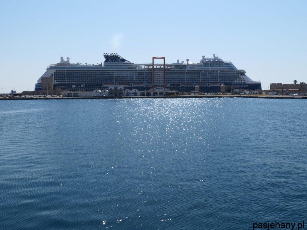 Przedostatni dzień na Rodos – a my płyniemy na wyspę Simi speed boatem Sebeco. Rejs wykupiliśmy wcześniej w Rodos. Kosztował nas 34 €/osobę. Punktualnie odebrano nas z hotelu, dowieziono do portu . Wypływamy z portu w Rodos. Tego dnia cumował akurat ogromny wycieczkowiec Celebrity Beyond.