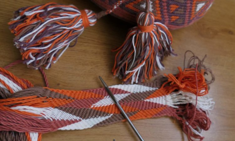 W jednym z wcześniejszych wpisów pokazywałam mochilę w wersji brązowej. Brakowało jej paska. Oryginalne mochile mają kolorowe, wesołe paski zrobione ze sznureczków sprytnie ze sobą połączonych. Właśnie dla ułatwienia łączenia tych sznureczków powstał gripfid. Jest to krótki drut, w środku którego jest podłuzny otwór. Do tego otworu wkłada się końcówkę sznurka i przeciąga przez pozostałe sznureczki. W ten sposób powstają właśnie takie kolorowe paski. Ja do swojej torby musiałam najpierw przygotować sznureczki. Każdy sznureczek musi być skręcony z trzech nitek. Potrzebowałam 32 sznureczki, po 8 z każdego koloru. W ten oto sposób powstaje kolorowy pasek. Ponieważ jest to mój pierwszy pasek – robótka powstaje dość wolno. Jak na razie jestem bardzo zadowolona z efektu. Pasek ma mieć długość 100 cm, więc przede mną jeszcze sporo pracy.