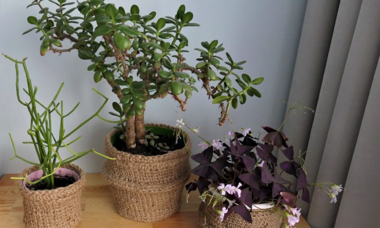 Chciałam ujednolicić osłonki na doniczki, które stoją na oknie. Wszystkie miały być ze sznurka.