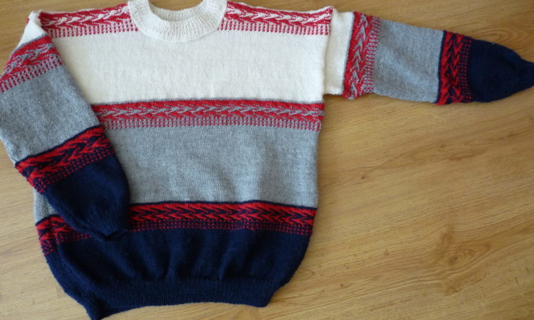 Długa nieobecność – wcale nie znaczy , że nic nie robię. Po pierwsze – leczę nogę po artroskopii, a po drugie – dziergam i dziergam. Z resztek , które zostały po robieniu sweterków dla Córeczki – powstał kolejny. Tym razem dla mnie. Oczywiście musiałam dokupić parę motków, przede wszystkim koloru granatowego. Wzór pasków zaczerpnęłam z czasopisma z 2003 roku – i oczywiście chętnie je udostępnię. Zastanawiam się nad produkcją filmiku – ale czy starczy mi odwagi ?