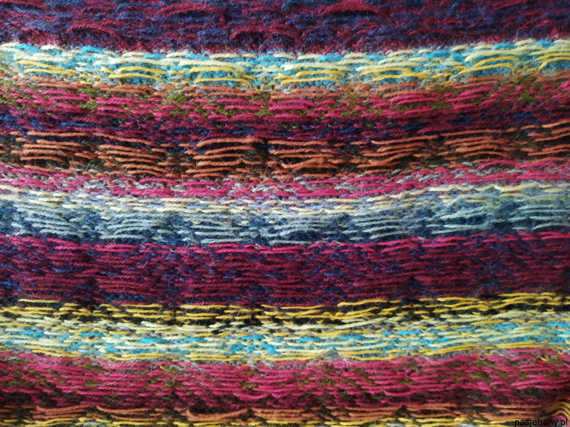Nie ma co się przerażać skomplikowaniem wzoru – bowiem w jednym rzędzie występują zawsze tylko dwa kolory, co ułatwia bardzo sprawę. Lewa strona wygląda tak –